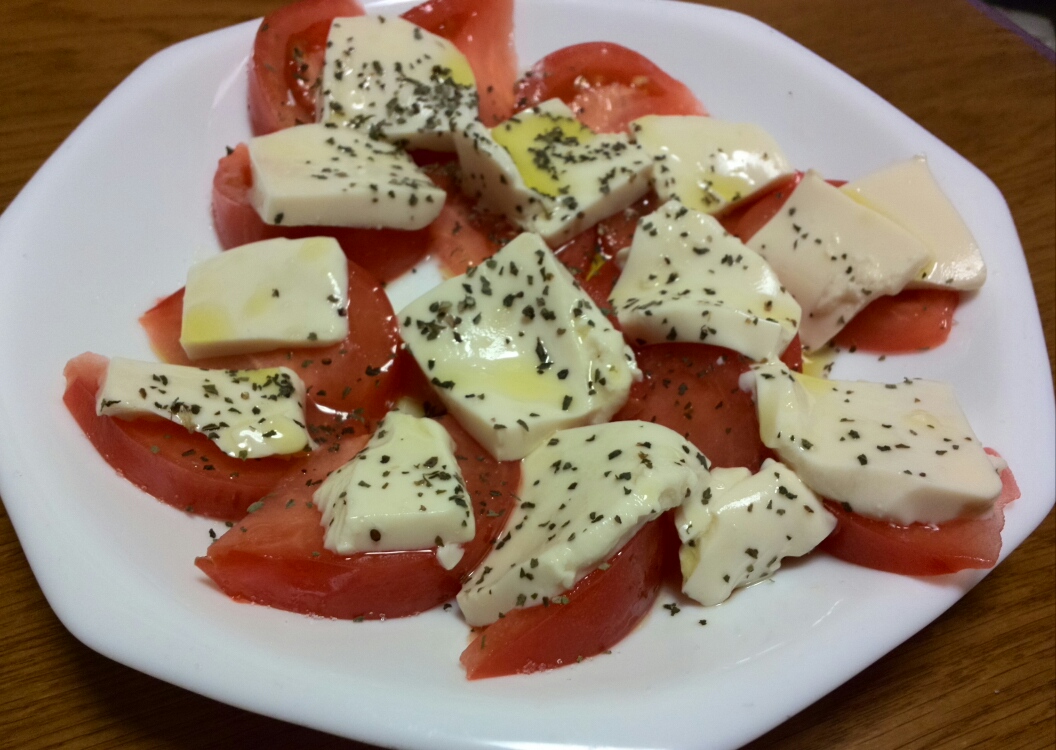 スライスしたトマトにスライスした豆腐を乗せ、その上から塩振ってオリーブオイルかけてあとバジル。