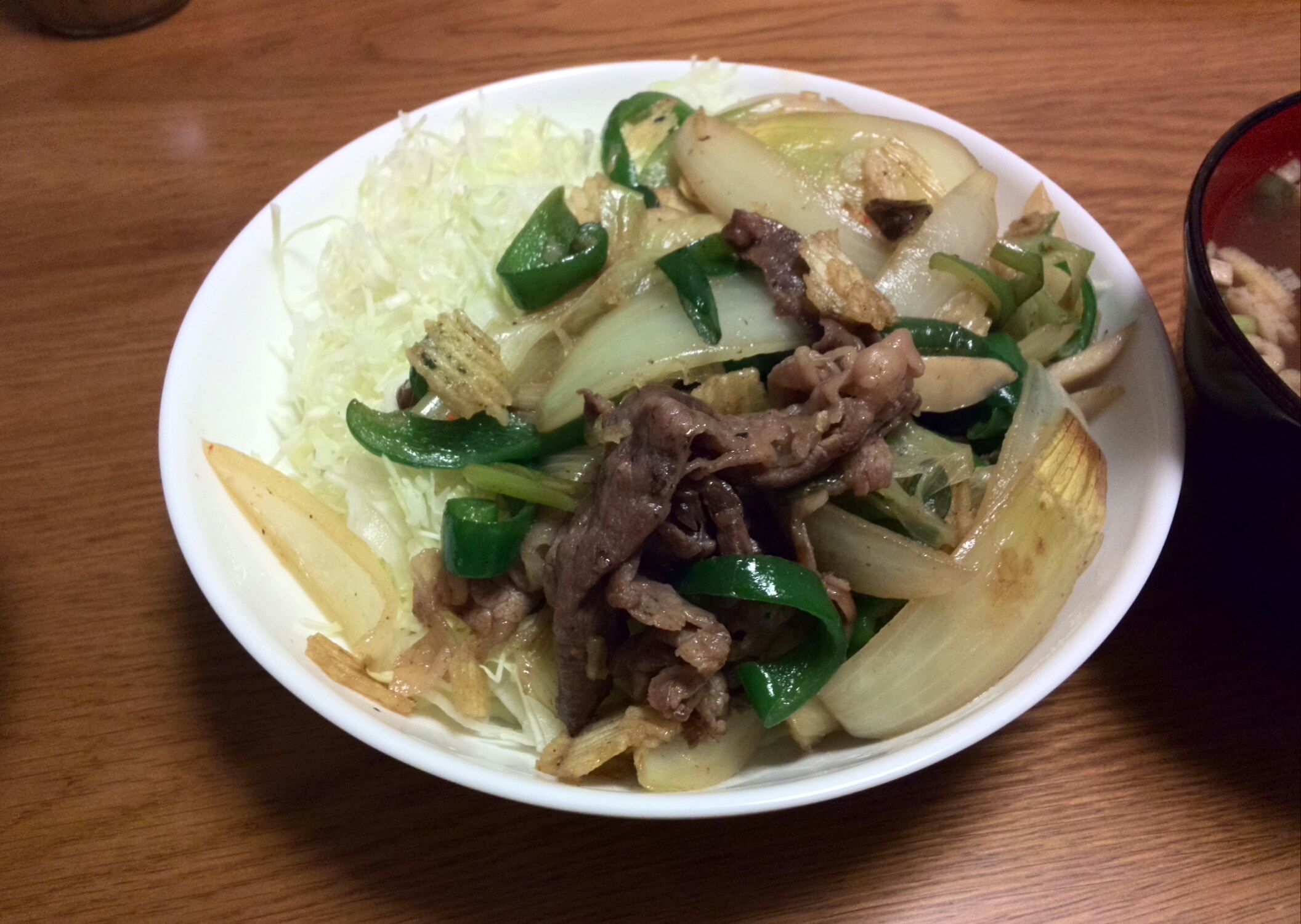 牛肉と玉葱、長ネギ、ピーマン、エリンギをすき焼き風の甘辛味に炒めたもの。