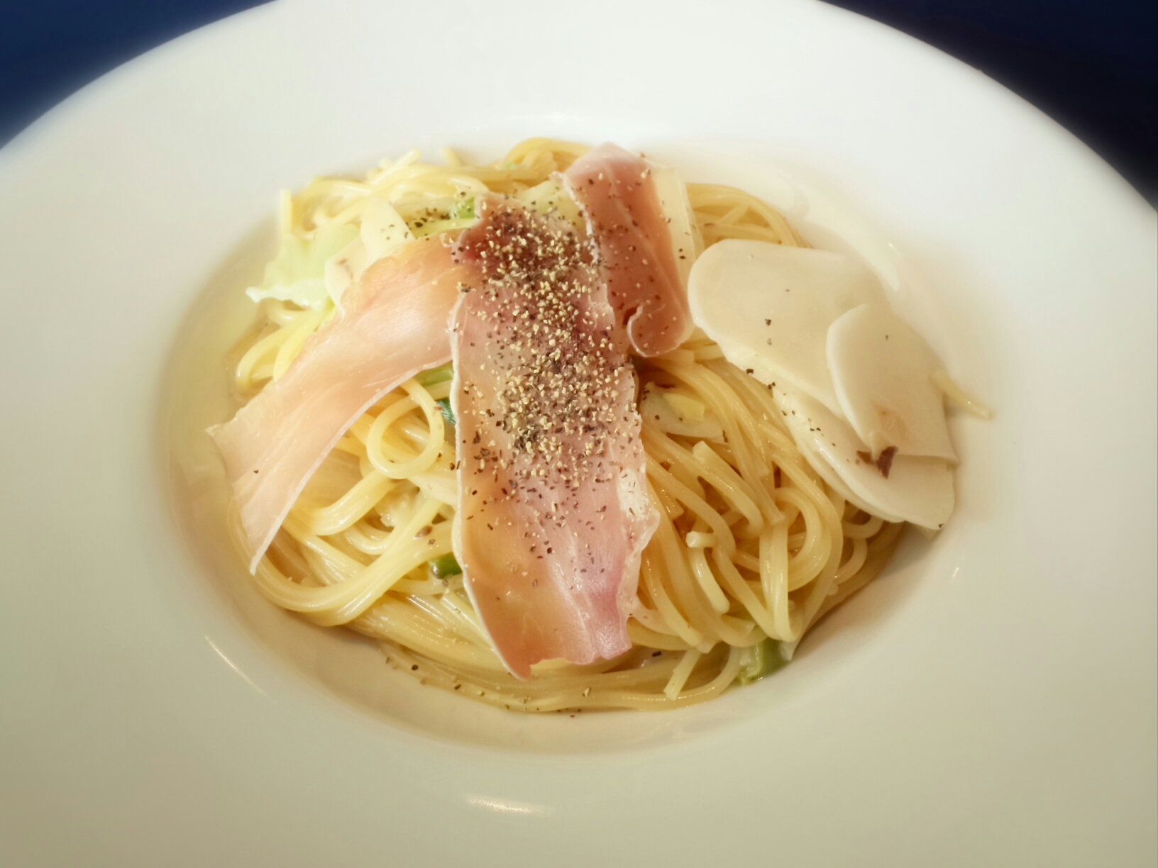 近所のおじさんがまた野菜をくれたので、貰った春菊、買ってきたキャベツ、豚肉、信州で買ってきた茸2種をバターとオリーブオイルで炒めた何か良く分からん物と、生ハムクリームチーズ、サラダ。