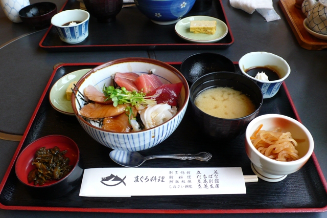 昼食は「マグロ赤身、とろびんちょう、いか」の三色丼のランチセット。 小鉢と味噌汁、だし巻きと漬物と「マグロのコーヒーゼリー」なる不可思議な物がセットで税込み1050円。 安いです。しかも魚が新鮮で旨い。コーヒーゼリーに関しては、何がマグロなのか良く分かりませんでしたw