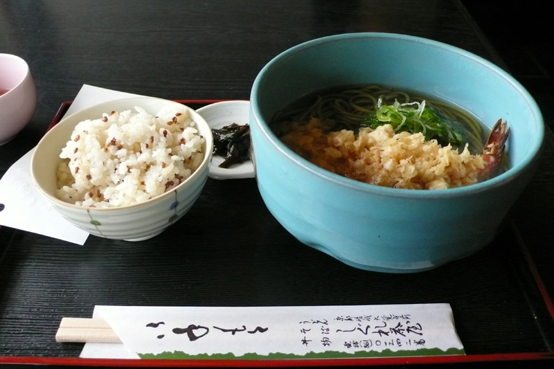 海老天が一本乗った蕎麦と、蕎麦茶を使ったご飯のセット。