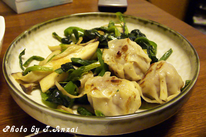 それと○エツで買っておいた焼売とエリンギとピーマン、茹でて小分け冷凍しておいたほうれん草を塩・胡椒・ラー油・中華味で炒めた中華風な炒め物