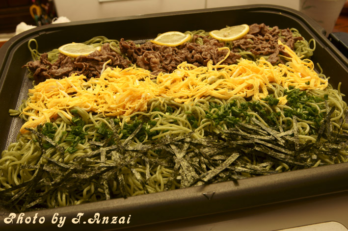 簡単に作り方を書くと、錦糸卵を作り、牛肉を炒めておいてホットプレートで茶そばを炒める