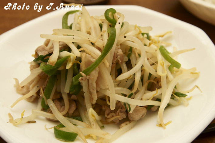 豚バラ、もやし、ピーマンを適当に味付けして炒める