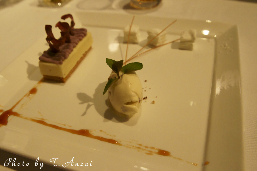 デザートはお芋のケーキとラムレーズンのアイス、ホワイトチョコのマシュマロ