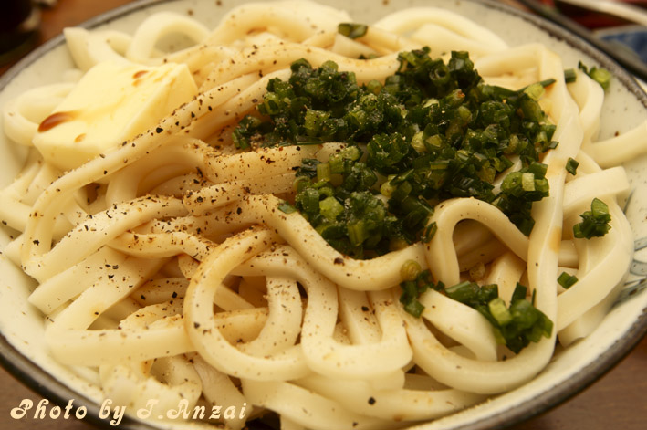 釜揚げしたうどんにバターと黒胡椒、醤油をかけて食べる