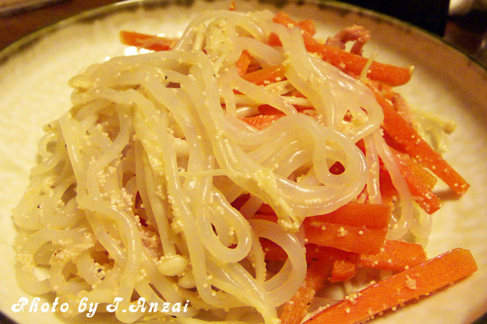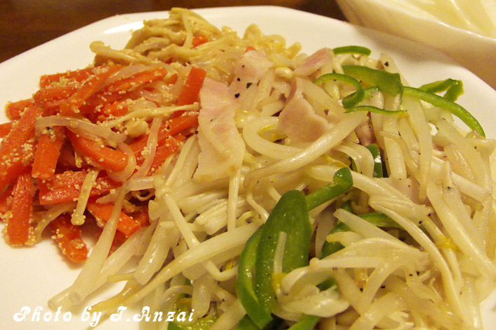 豚ロース、ぶなしめじ、人参、ピーマン、もやし、小ネギをオイスターソースや胡椒、ごま油で中華風に味付けした炒め物