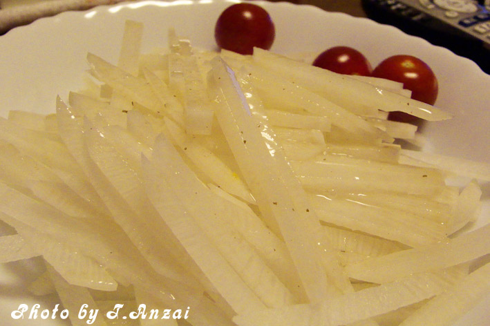 えのき、エリンギ、人参、ピーマンをたっぷりのオリーブオイルと塩胡椒、タバスコで炒めた野菜炒め