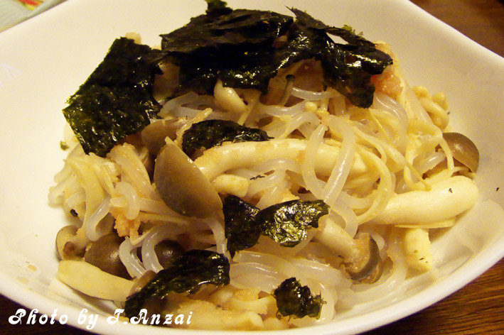 最後のは白滝とえのきだけ、ぶなしめじを塩とタバスコで炒め、火を止めてから辛子明太子を混ぜて余熱で少し炒め、最後に海苔をかける