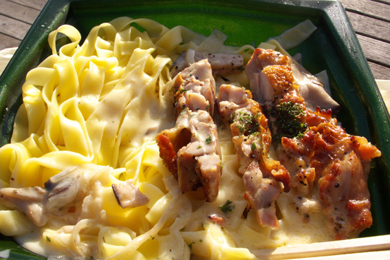 クリームソースのパスタを頬張る