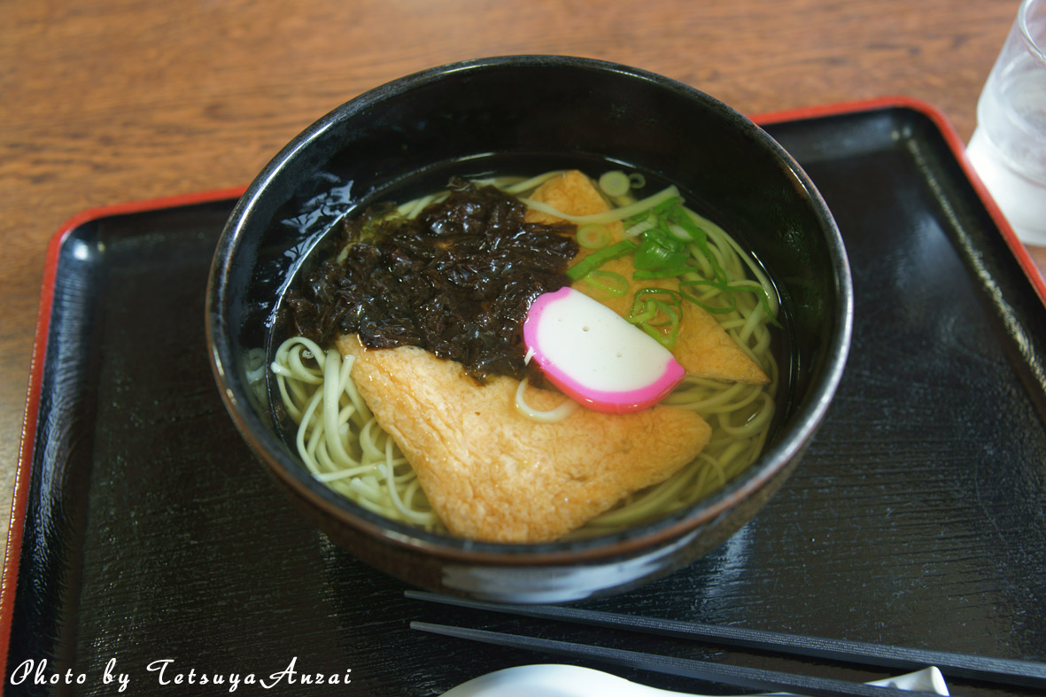 ちょっと緑色した細めのうどんで、少しだけコシがあって美味。