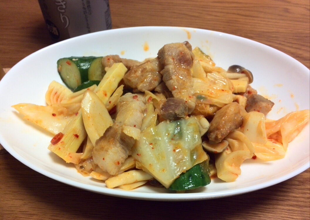 野菜とはまぶたロースをキムチで炒めました。