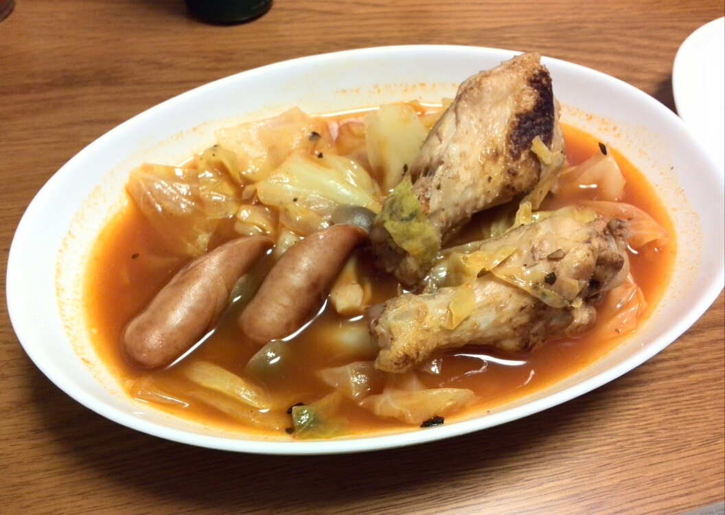 今日の夕食は前回のキムチ炒めの残り具材と、冷凍に入れっぱなしだった手羽元とウインナーを入れて洋風煮込み。
