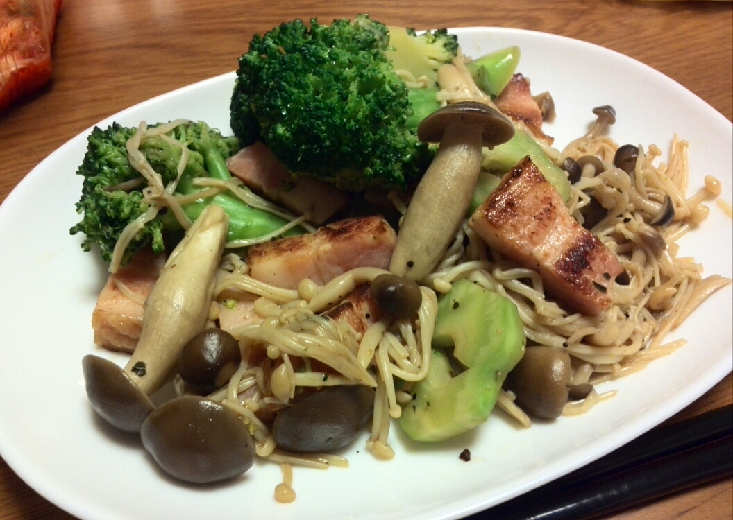 今日は角切りベーコンと3種のきのこ、ブロッコリーの炒め物で一杯。