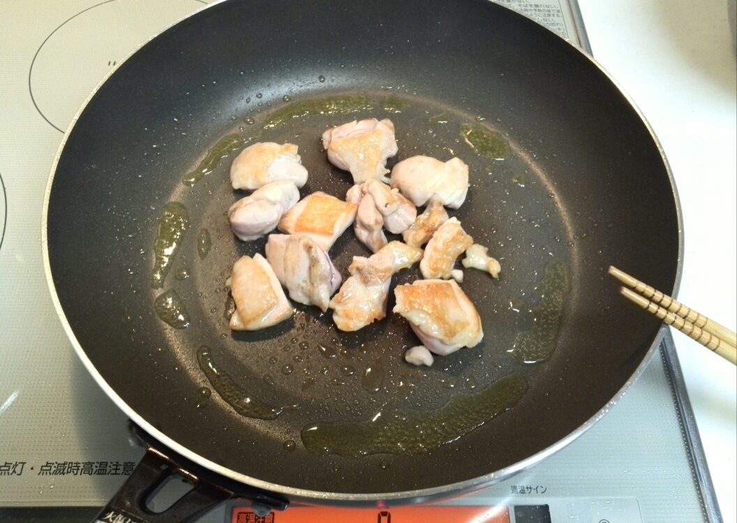 鶏肉をオリーブオイルで炒め焼き色を付けます。