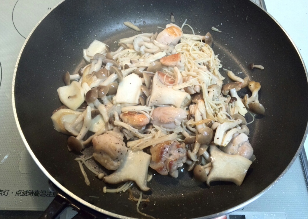 次にエリンギ、ぶなしめじ、えのき茸、安くて健康的な茸三人衆を入れ暫く蒸し焼き。