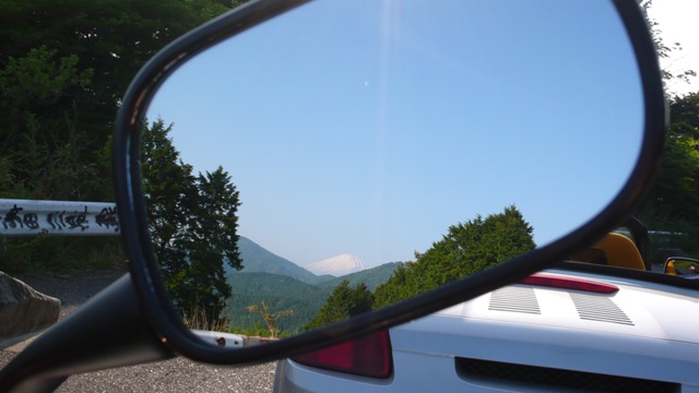 写真3:友人の車を背景に、ボルドールのミラーに写った富士