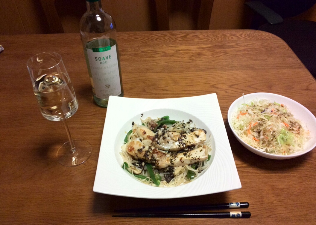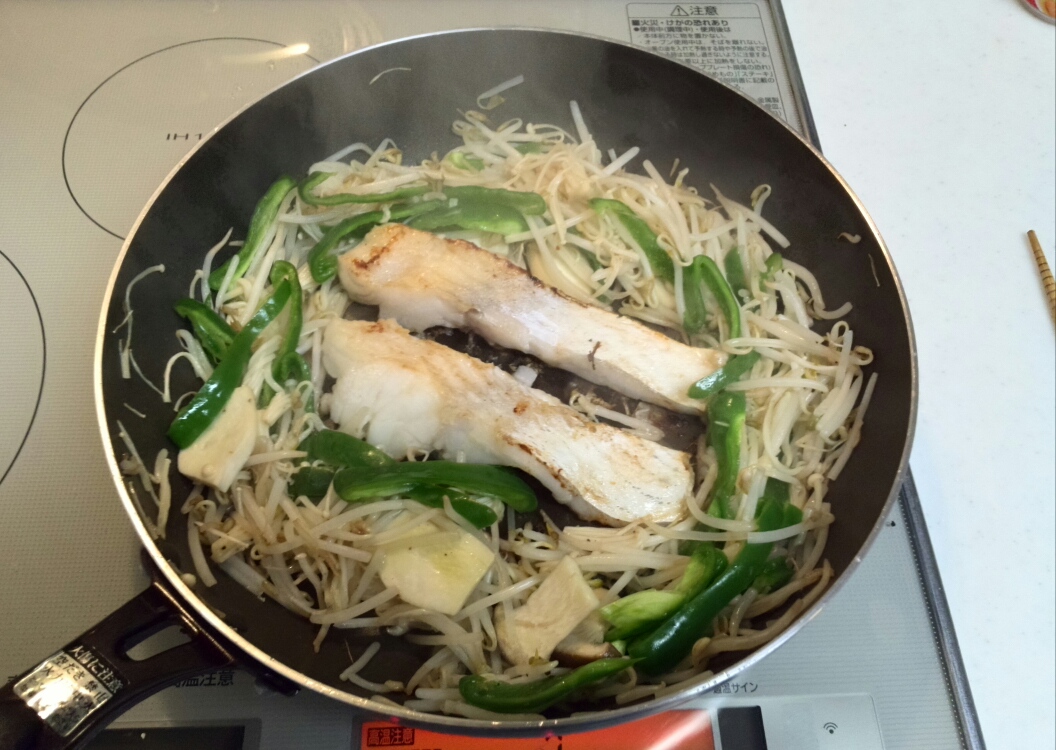 鱈は片栗粉をまぶして、バジルと白ワイン、オリーブオイルで煮詰めたソースをかけて。