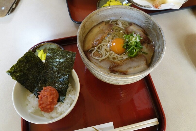 嵐山の駅近くに戻り、角煮そば&明太ごはんのセットを注文。