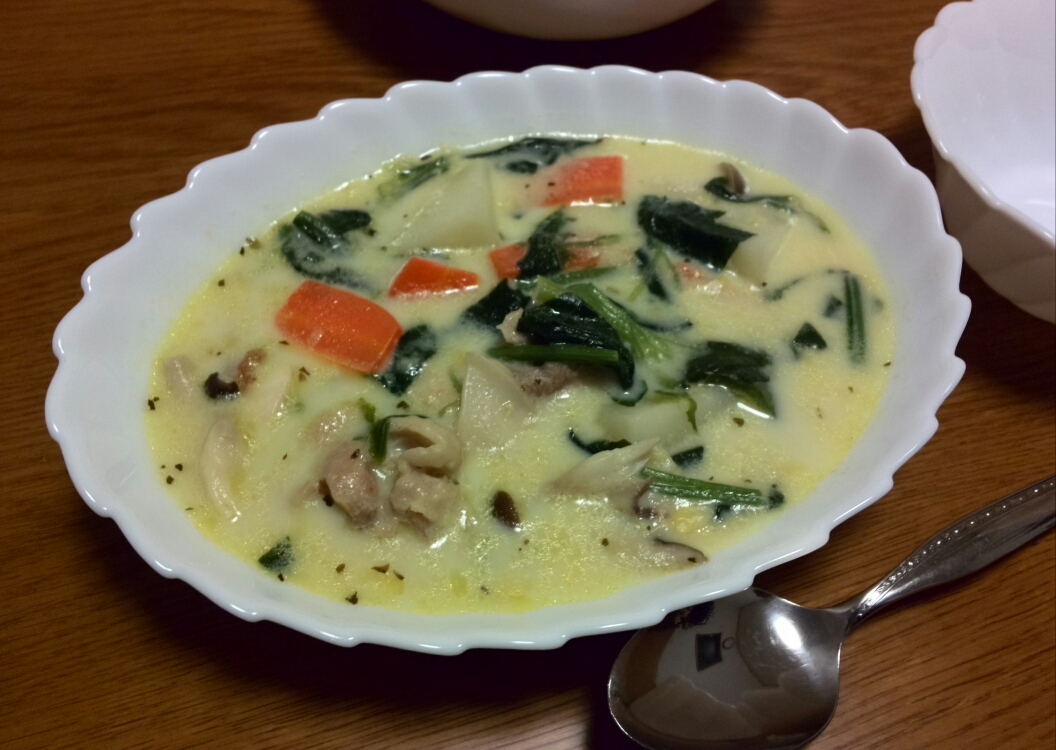 今日の夕飯は賞味期限がちょっとだけ切れた牛乳と賞味期限が思いっきり切れた缶詰のコーンペーストで野菜たっぷりスープ。