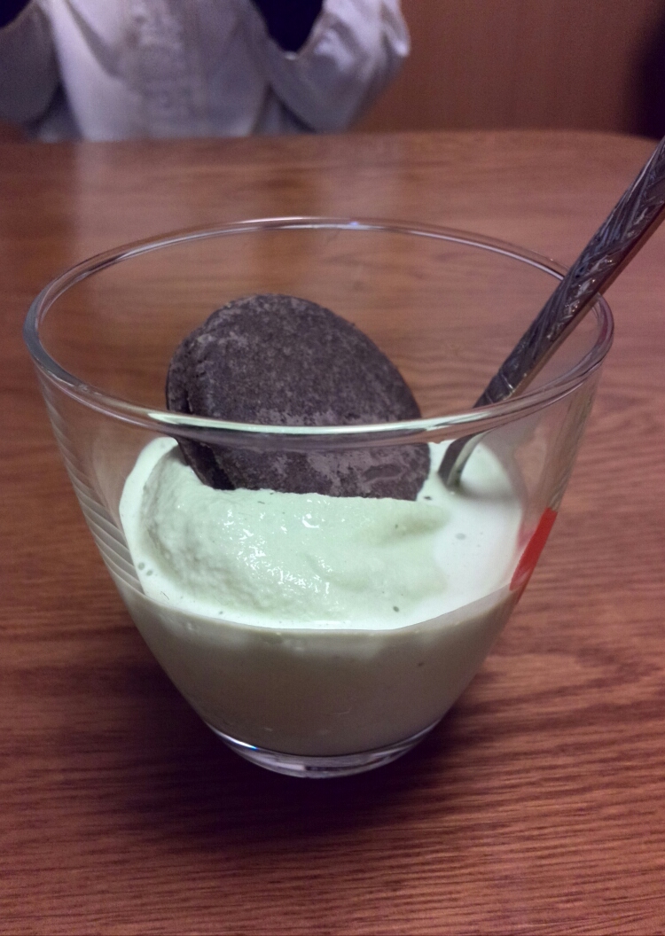 デザートはスーパーカップバニラに藤枝のななやで買ってきた抹茶を混ぜ、明治の抹茶チョコを挟んだビスケットを添えて。