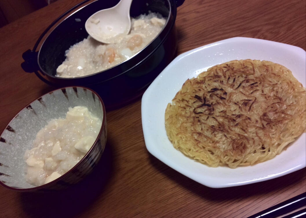 シーフードミックスと豆腐を使って中華粥を作り、残っていた焼きそばの麺をごま油と顆粒鶏ガラでじっくり焼き上げたおこげ。