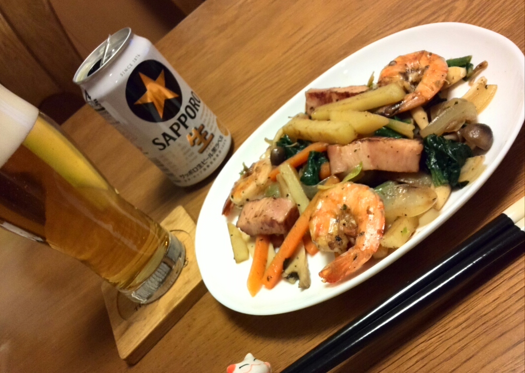 夕飯はきのこやじゃがいも等の野菜を殻付きの海老、ベーコンと一緒に炒めた物。