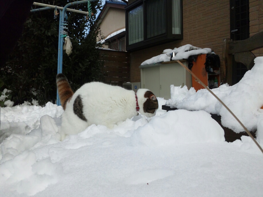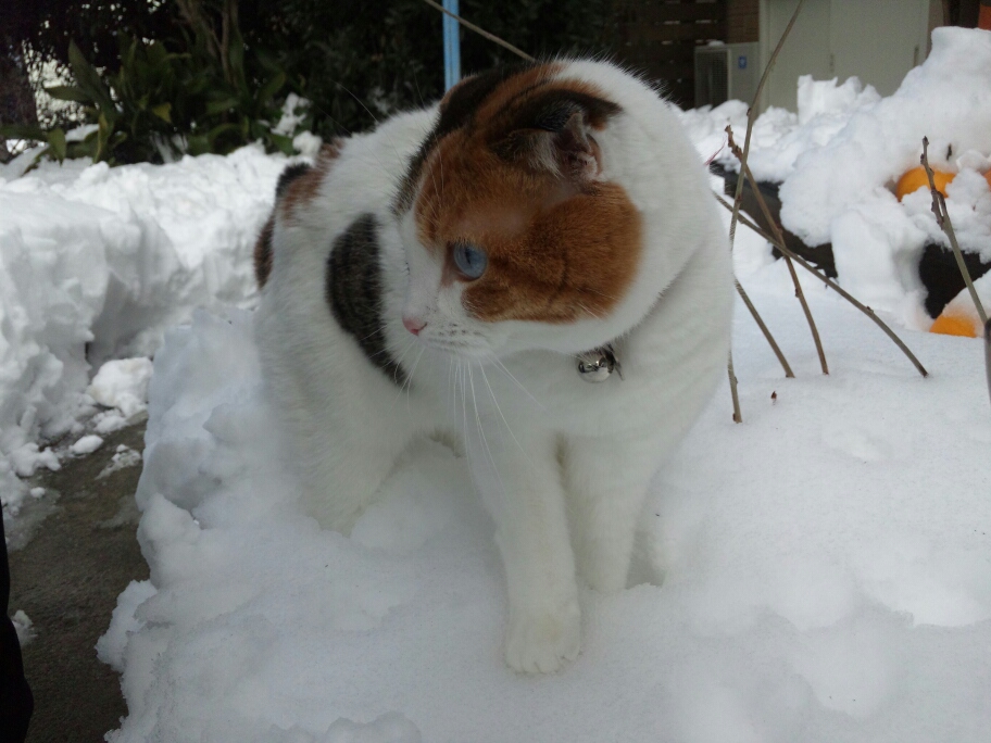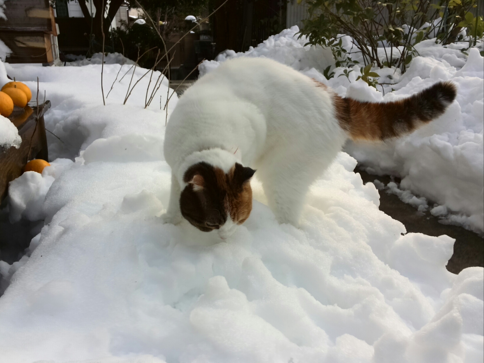今日は庭に積もった雪をカナに見せてみて、どんな反応するかなーって。