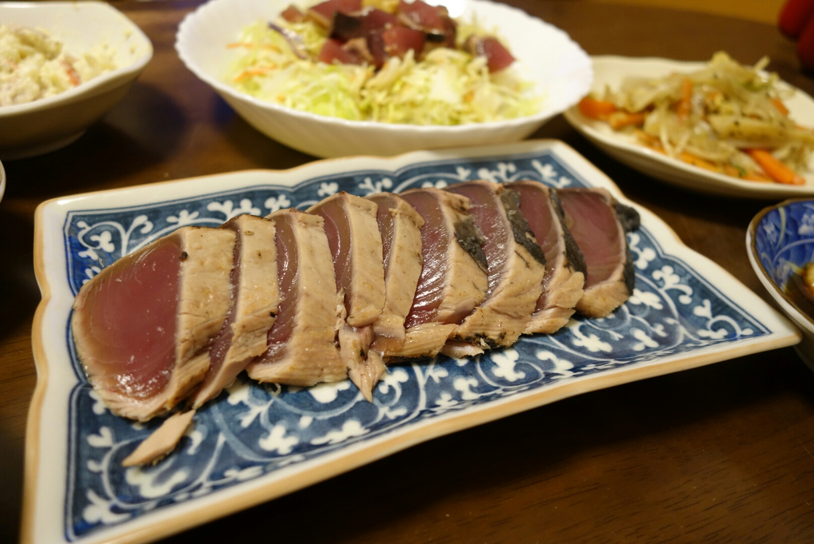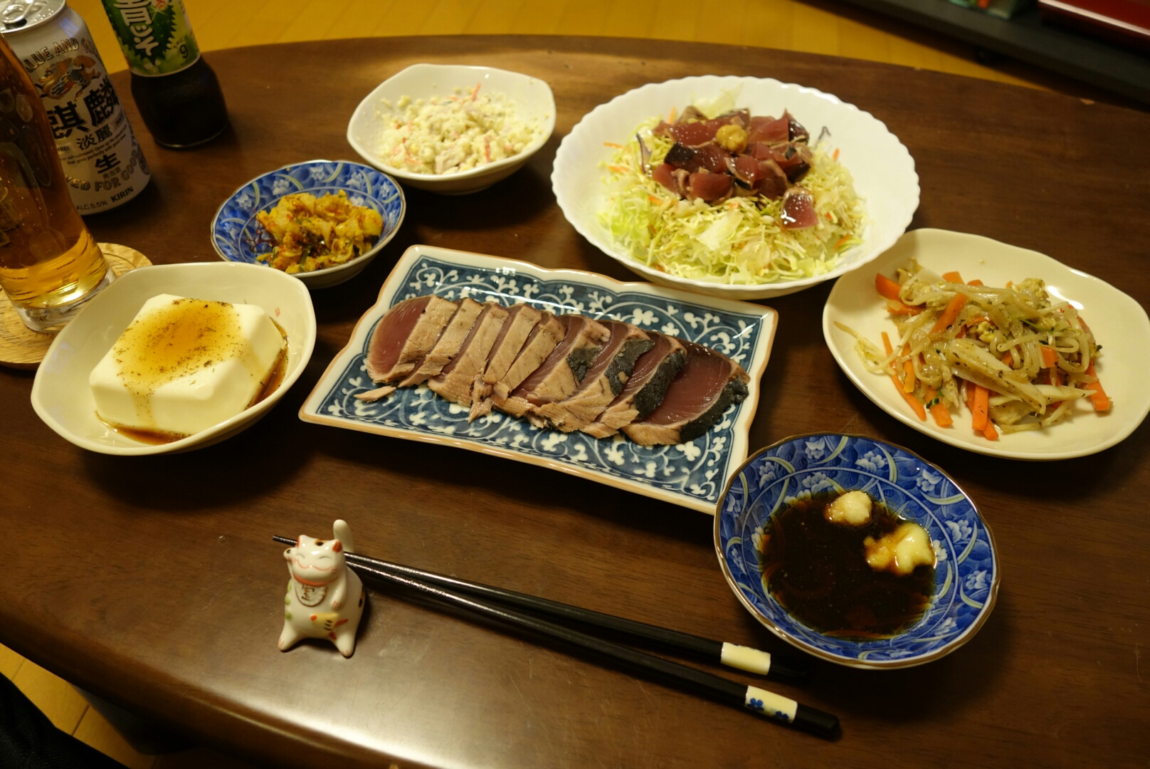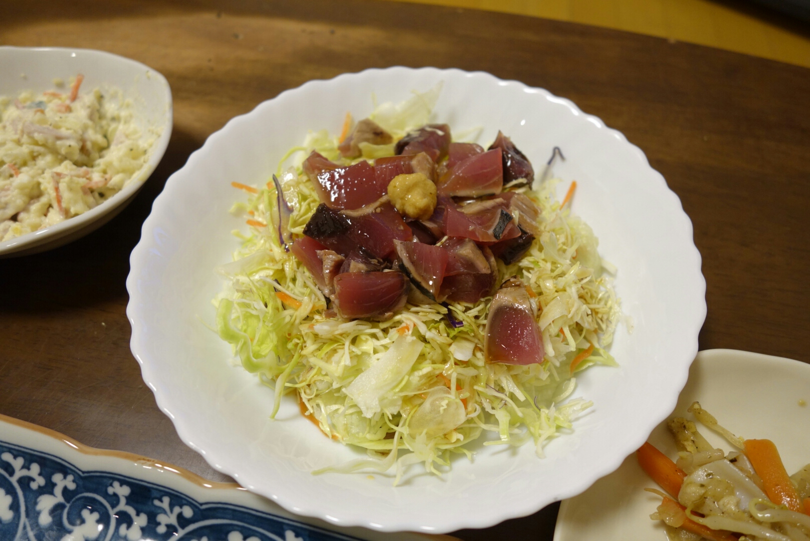 帰りにスーパーで値引き品の鰹たたきを買ったので、そのままスライスと小さく切って青じそドレッシングと一緒にサラダで。