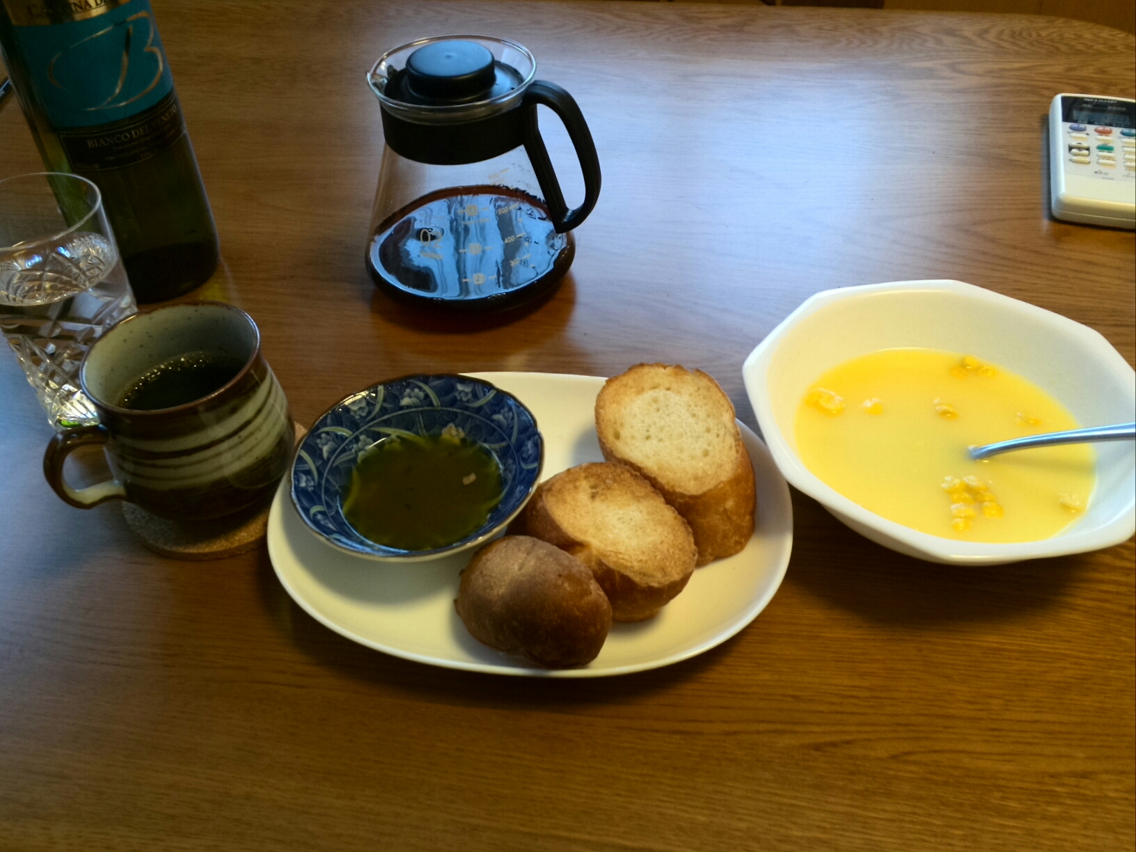 フランスパンをトーストして、オリーブオイル煮の残りオリーブを浸け、カップスープとマンデリン珈琲。