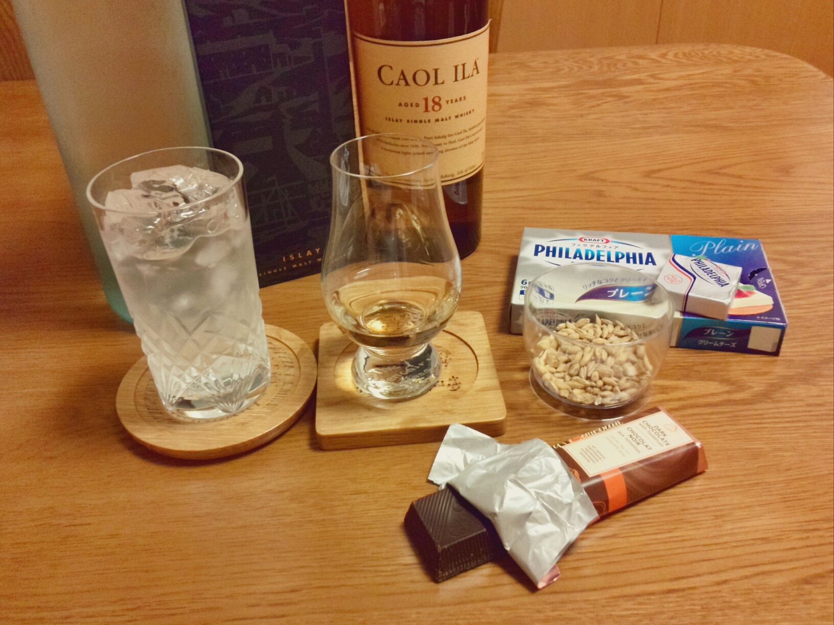つまみはモルトとクリームチーズとヘーゼルナッツ入りチョコ。