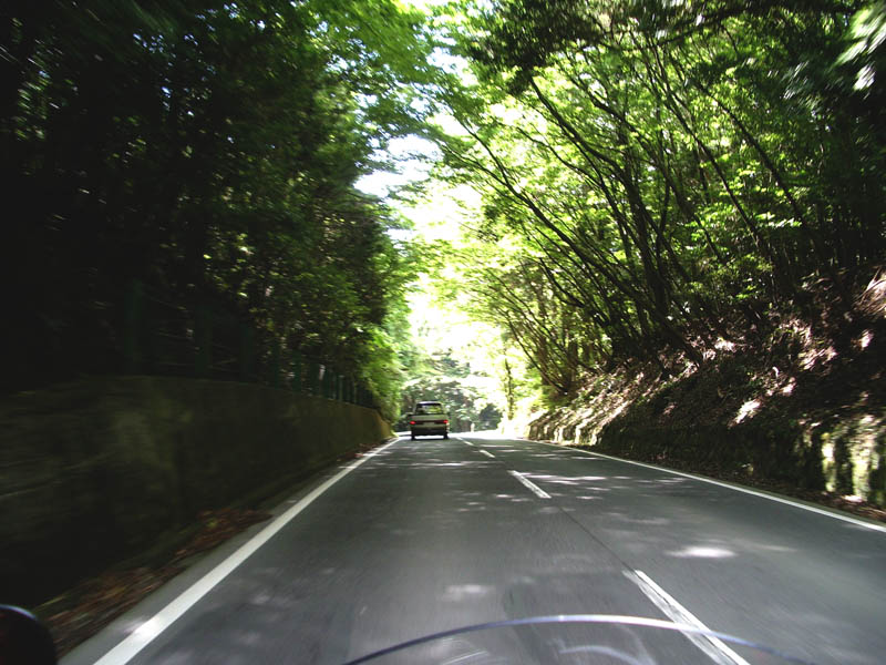 仁科峠を過ぎて59号線を走っていると木漏れ日が綺麗な道になっていた。