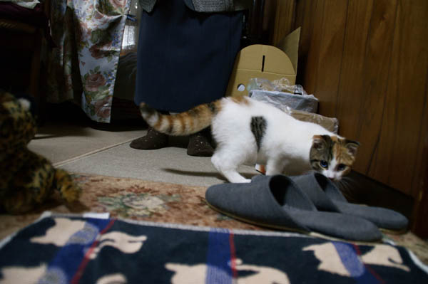 そして猫じゃらしにじゃれ、ジャガーのぬいぐるみに警戒するカナ。