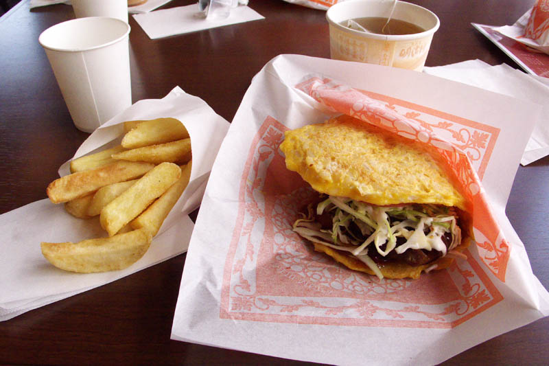 早速入り名物の「お米のオムレツバーガー」のセットを注文した