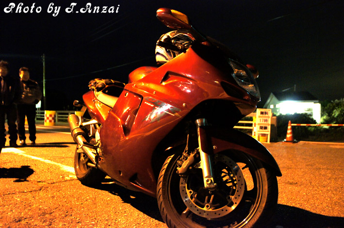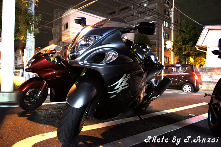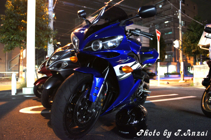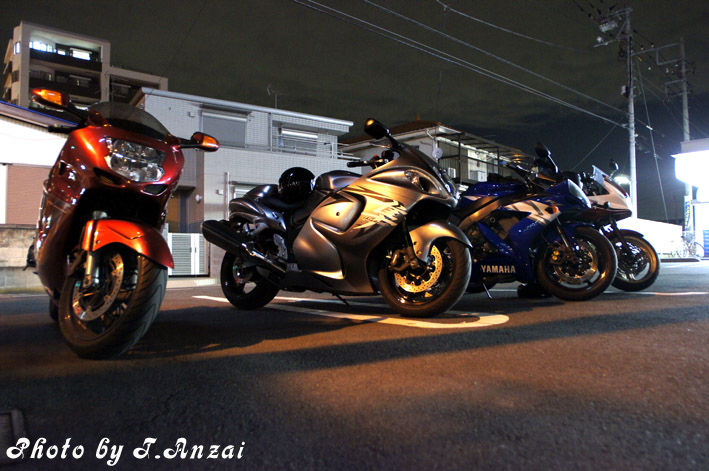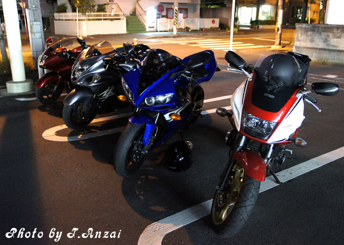 21時半に三十一番集合だったので少し早めに行くとマスターの隼と青いYZF-R1(以下R1&R1さん)が停まっていて、隼は暖気&チェック中でした