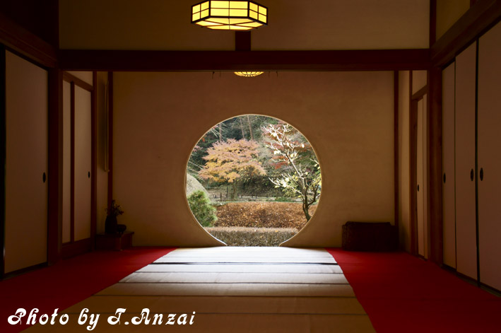 この明月院には名物があり、丸く切り取られた壁から見える反対側のお庭が、一枚の絵画の様に存在感を強めている