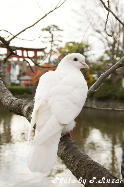 下に下りてちょこっと脇の池を覗いていたら、真っ白で綺麗な鳩を発見