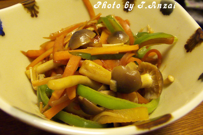 今回は人参、ピーマン、えのきに加え冷蔵庫内に残っていたしめじを投入