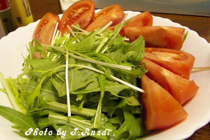 それに生野菜として水菜とトマトのサラダ