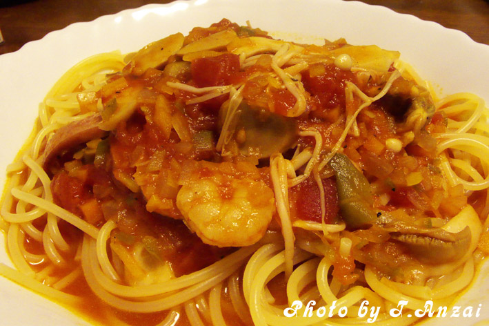缶詰のマッシュルームとえのきだけ、シーフードミックス、カットトマトを鍋に入れて塩・胡椒、ケチャップで味付けをしてバジルとオリーブオイルで香り付け