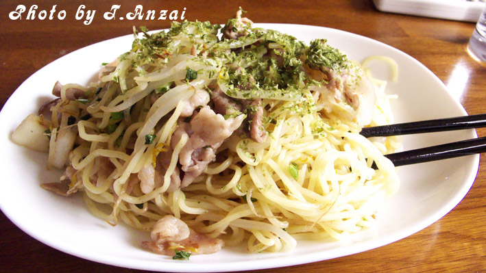 3月2日、昼飯にと塩焼そばを作って婆ちゃん爺ちゃんと3人で食べた