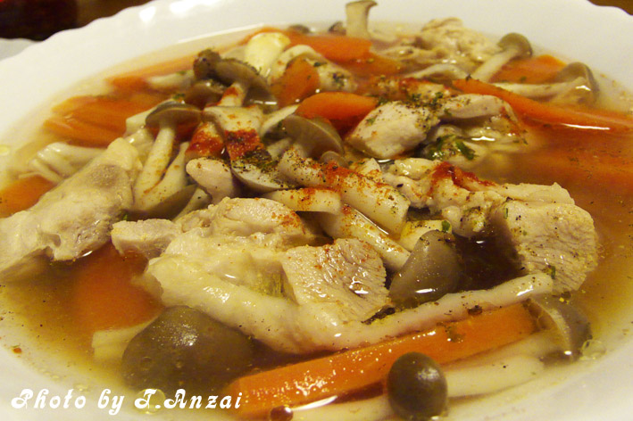 そして今日の晩御飯は簡単に鶏肉と人参、エリンギ、ぶなしめじを煮ただけ