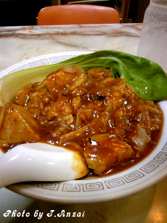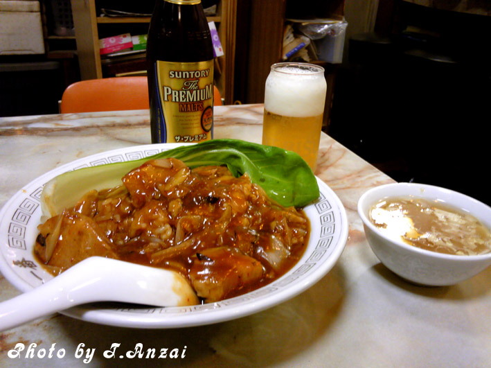 先ずは上に乗ってる角煮とチンゲン菜、ネギでビールを飲み、最後にタレと残った角煮でご飯を食べる