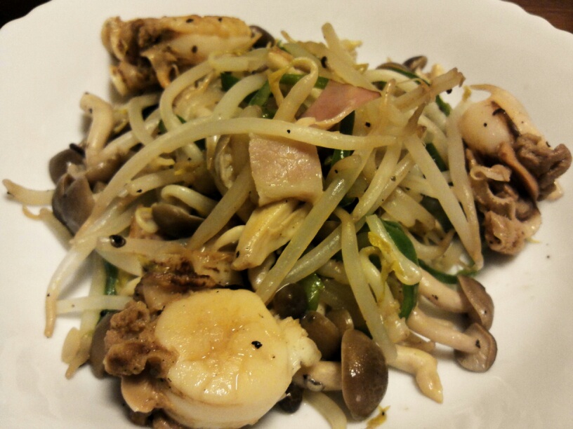 今日はホタテ、もやし、しめじ、ピーマン、ベーコンのバター炒め