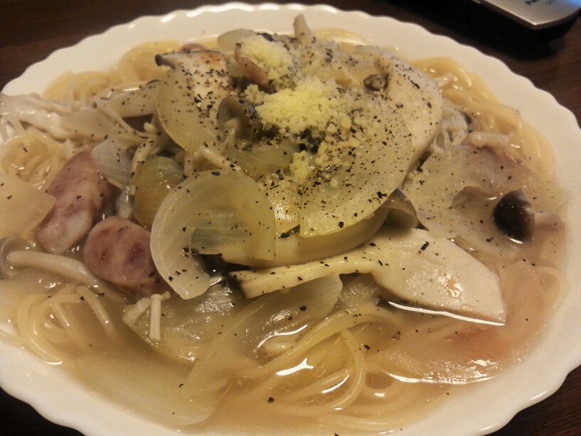 そんな今日は簡単に「3種のキノコとタマネギのスープパスタ」で簡単に夕食を済ませた