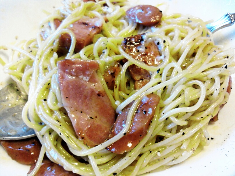 厚切りベーコンとチョリソーを炒め、麺を入れてチューブのにんにく投入