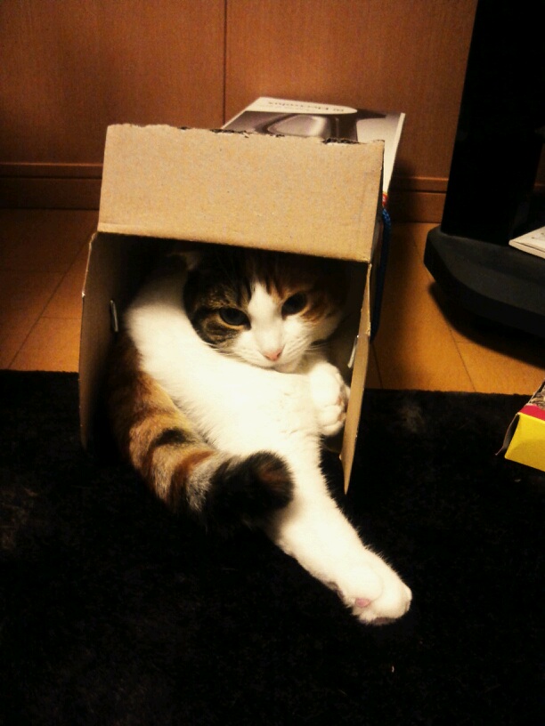 リビングで入浴後のストレッチをしているとカナがまた箱へ