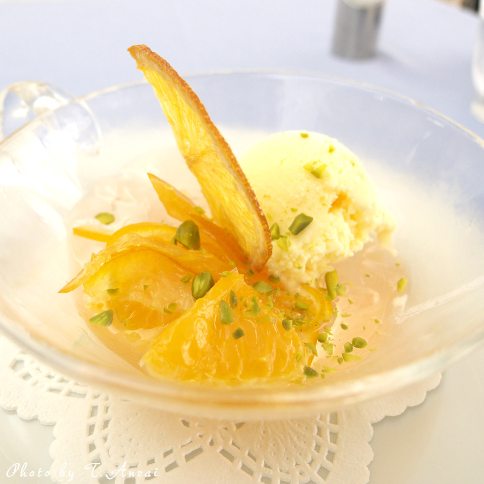 アイスはヨーグルトのジェラートで、普通のバニラやミルクとは違った酸味とコクがあり、これが柑橘のコンポートと一緒に食べると良く合う