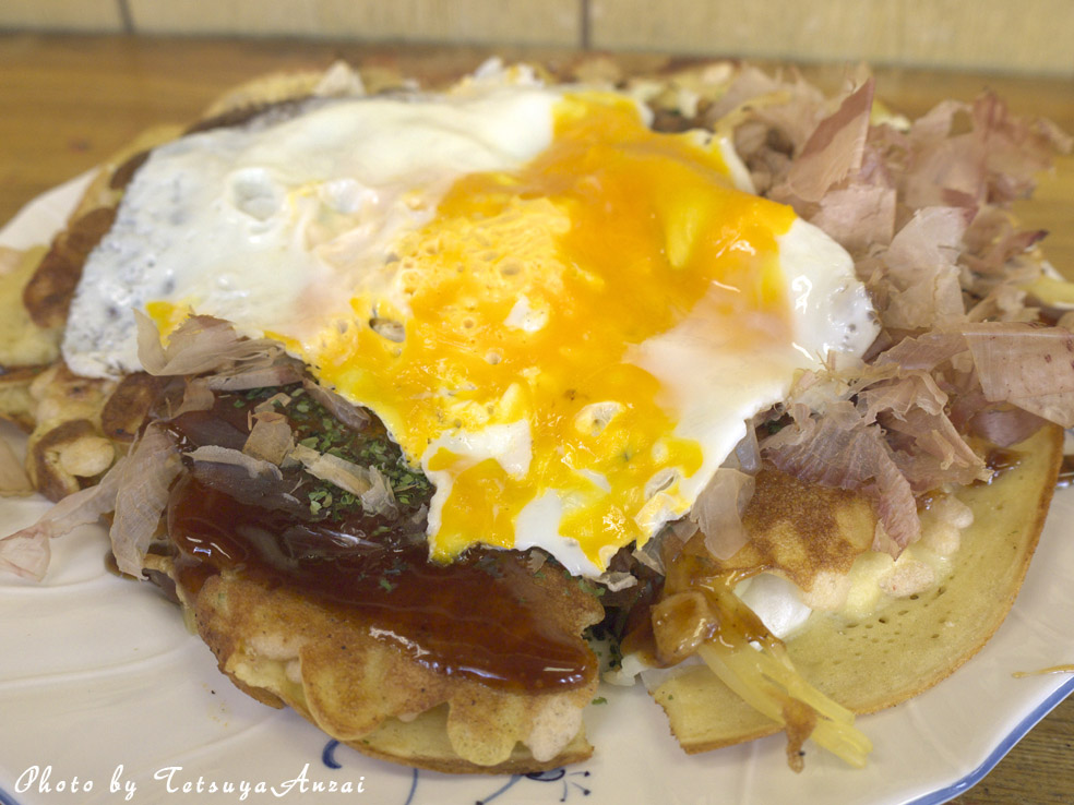 生地は薄めなのですが、焼きそば入ってチーズたっぷり入って、卵も乗っちゃって
