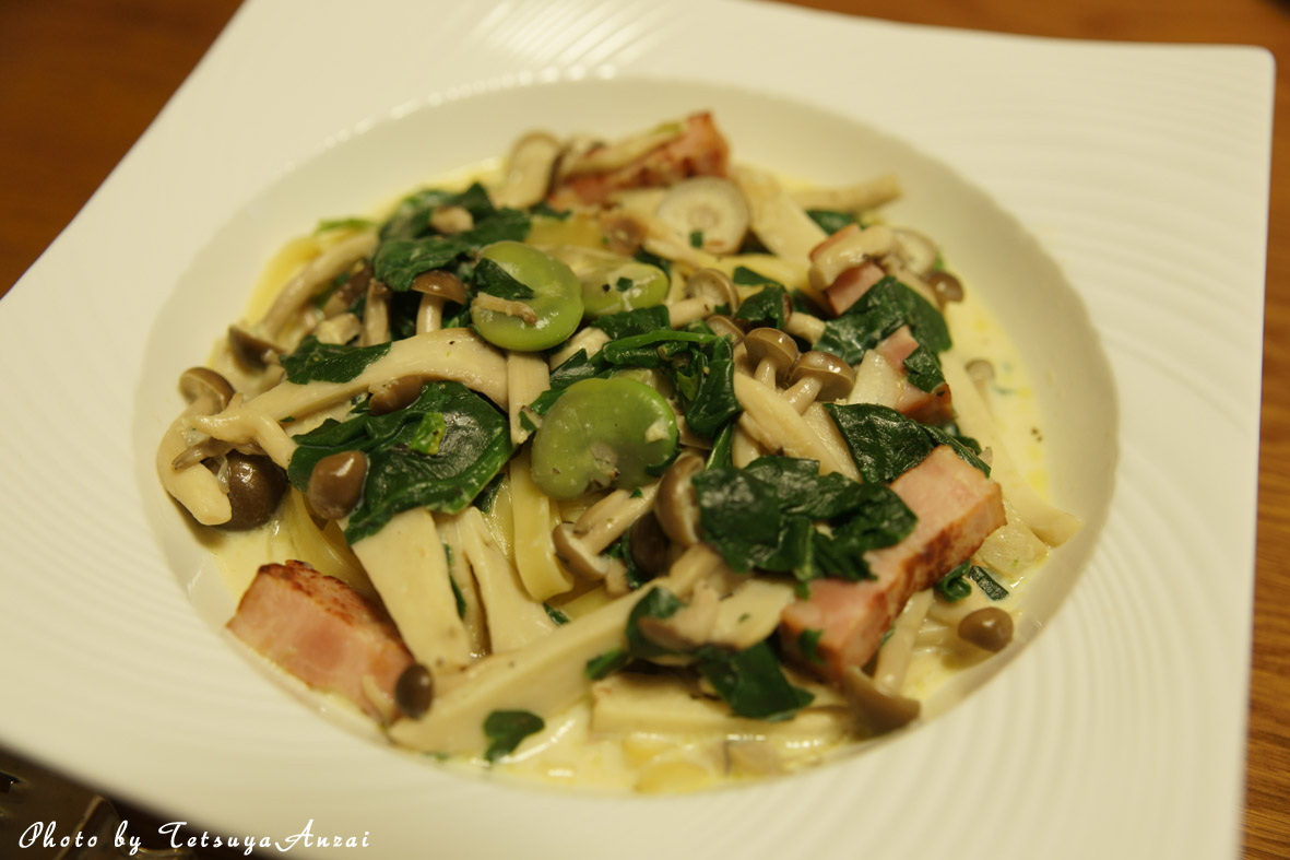具材はぶなしめじ、エリンギ、ほうれん草、そら豆、ベーコン